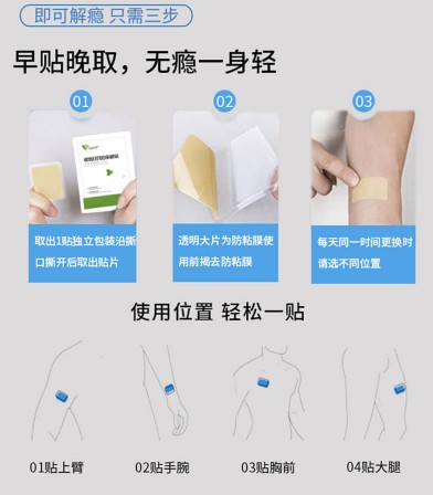 产品用法简单位置灵活三步即可止瘾,让你轻松拥抱健康,早贴晚取,无瘾一身轻.