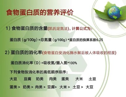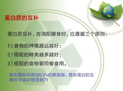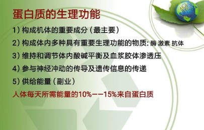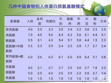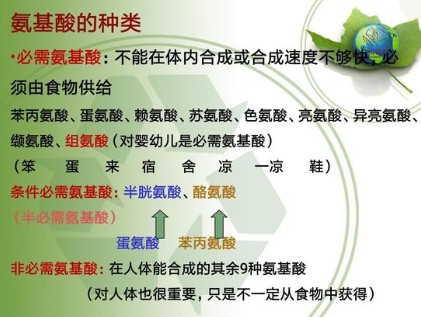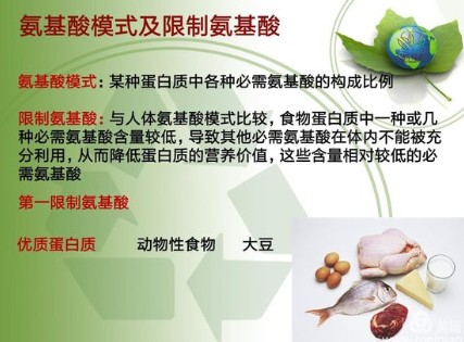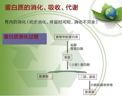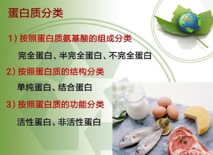 食入的蛋白质在体内经过消化被水解成氨基酸被吸收后,合成人体所需蛋白质,同时新的蛋白质又在不断代谢与分解,时刻处于动态平衡中。因此,食物蛋白质的质和量、各种氨基酸的比例,关系到人体蛋白质合成的量,尤其是青少年的生长发育、孕产妇的优生优育、老年人的健康长寿,都与膳食中蛋白质的量有着密切的关系。蛋白质又分为完全蛋白质和不完全蛋白质。富含必需氨基酸,品质优良的蛋白质统称完全蛋白质,如奶、蛋、鱼、肉类等属于完全蛋白质,植物中的大豆亦含有完全蛋白质。缺乏必需氨基酸或者含量很少的蛋白质称不完全蛋白质,如谷、麦类、玉米所含的蛋白质和动物皮骨中的明胶等。