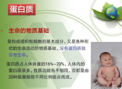蛋白质(protein)是生命的物质基础,是有机大分子,是构成细胞的基本有机物,是生命活动的主要承担者。没有蛋白质就没有生命。氨基酸是蛋白质的基本组成单位。它是与生命及与各种形式的生命活动紧密联系在一起的物质。机体中的每一个细胞和所有重要组成部分都有蛋白质参与。蛋白质占人体重量的16%~20%,即一个60kg重的成年人其体内约有蛋白质9.6~12kg。人体内蛋白质的种类很多,性质、功能各异,但都是由20多种氨基酸(Amino acid)按不同比例组合而成的,并在体内不断进行代谢与更新。